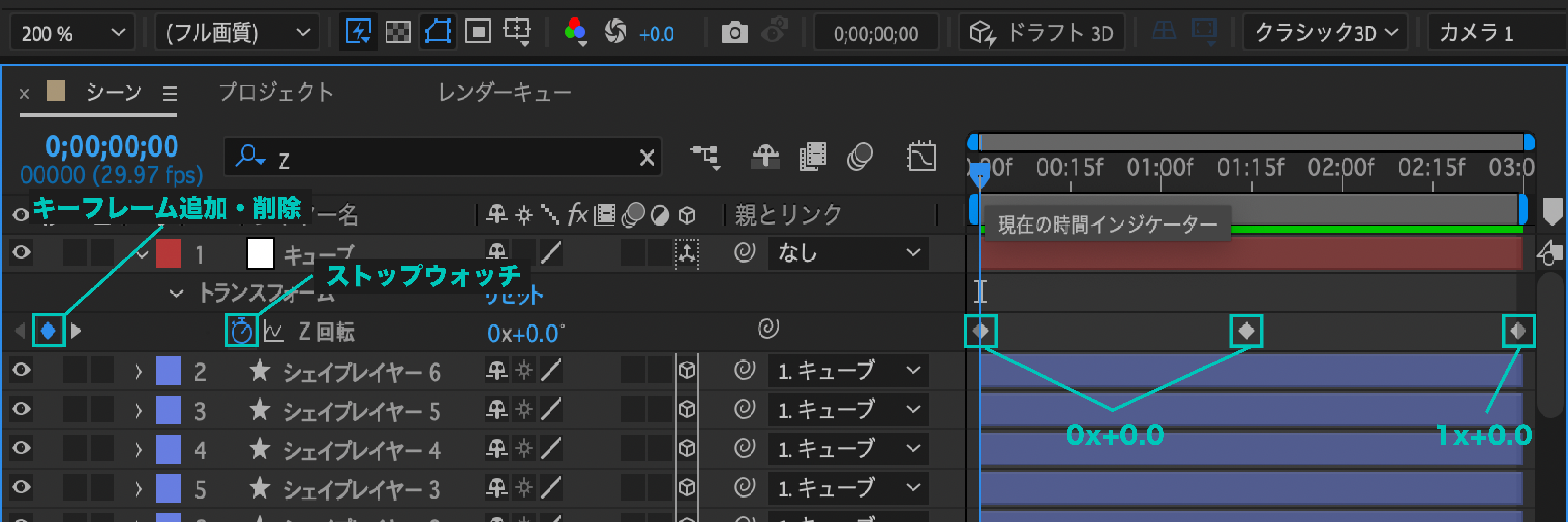 上から確認すると、最初にヌルオブジェクトを作成しています。ヌルオブジェクトは複数のオブジェクト(シェイプなど)をグループ化して操作するために利用します。作成したヌルオブジェクトを3Dレイヤーとして扱い、カメラを子要素に設定しています。これによりにヌルオブジェクトのトランスフォームを弄ることで、カメラの位置を画面中央を基点に変更できるようになります。